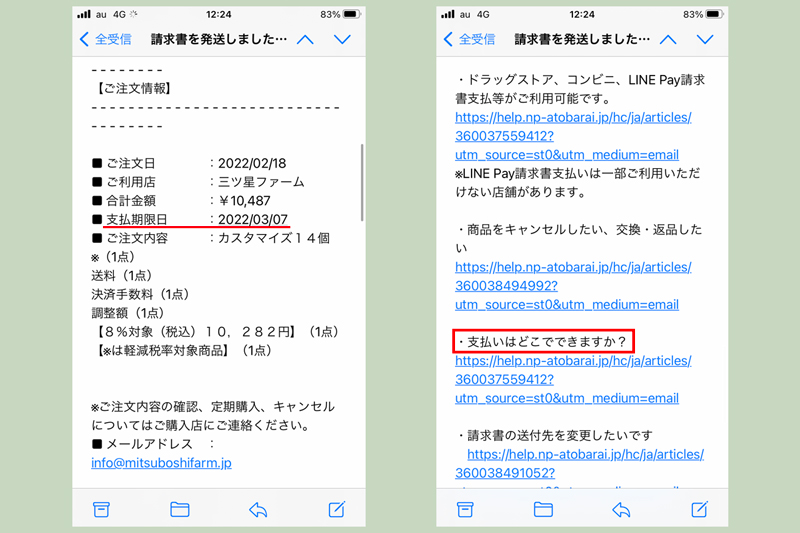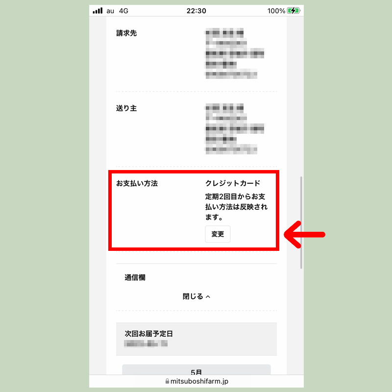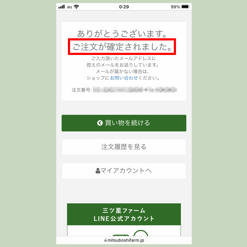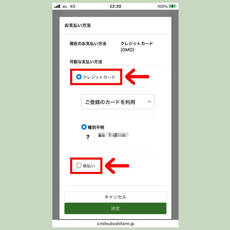 後払いをしたあと、三ツ星ファームへ電話した際に支払い方法を変更できるか聞いてみたら、その場でクレジットカードへ変更する手続きをしてもらえました。