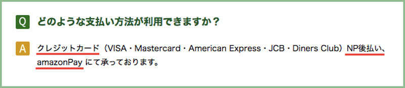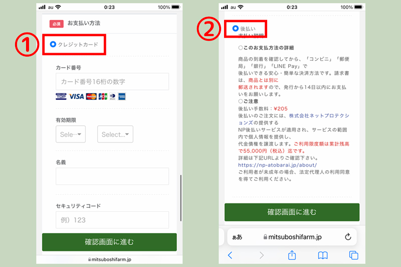 こちらは実際の注文するときの画面ですが、「クレジットカード」と「後払い」↓
