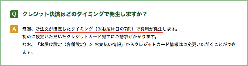 決済が発生するタイミングは注文が確定する日(お届けの7日前)とよくあるご質問に書かれていました↓