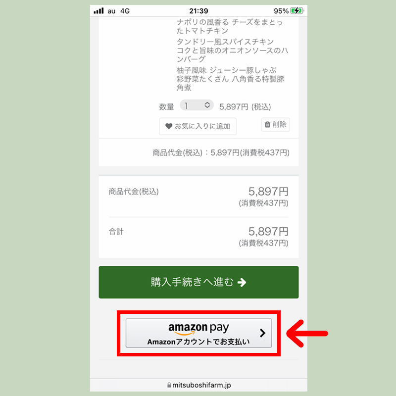 注文画面で「購入手続きへ進む」ではなく、「Amazon pay」をクリック↓