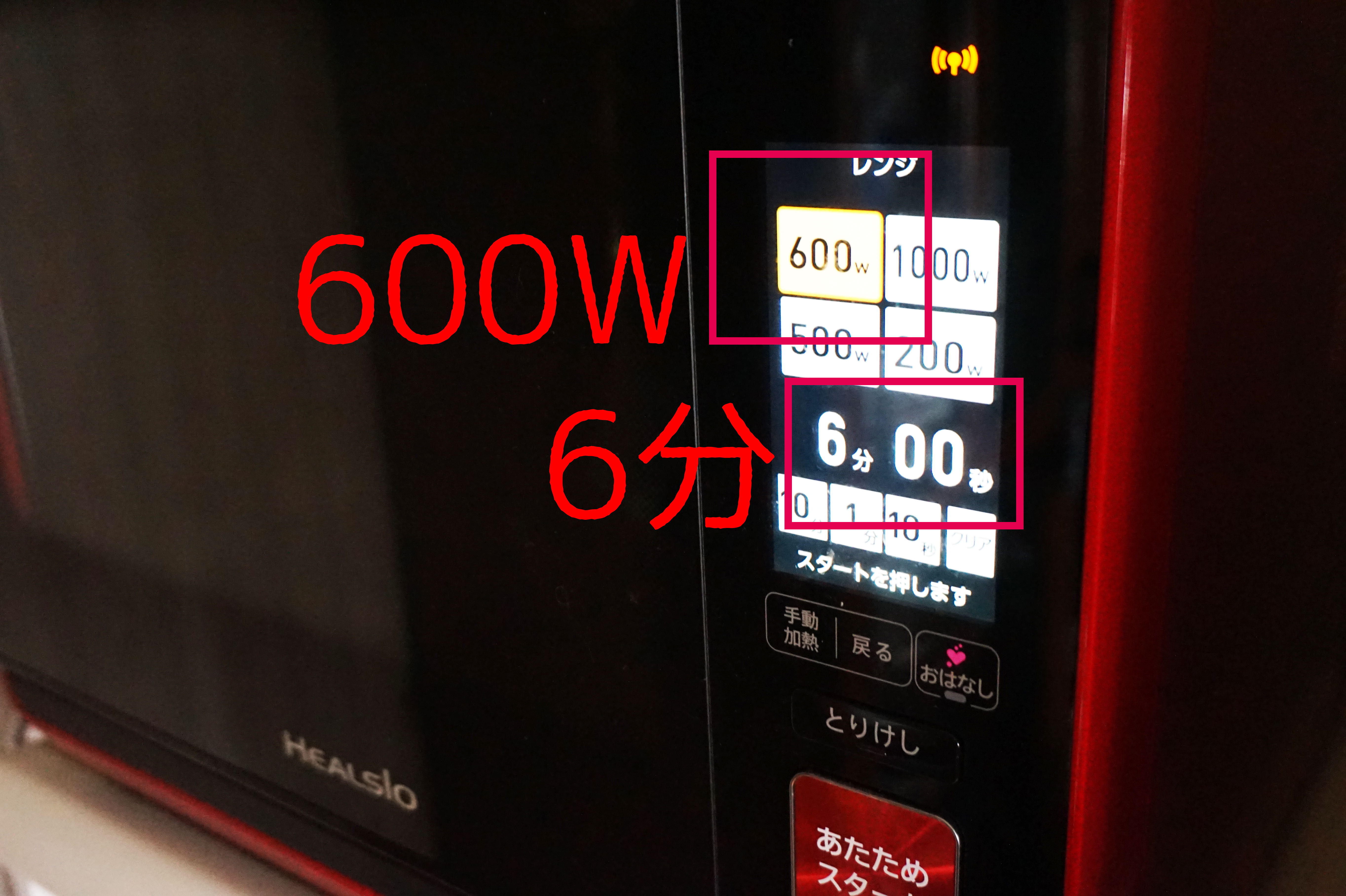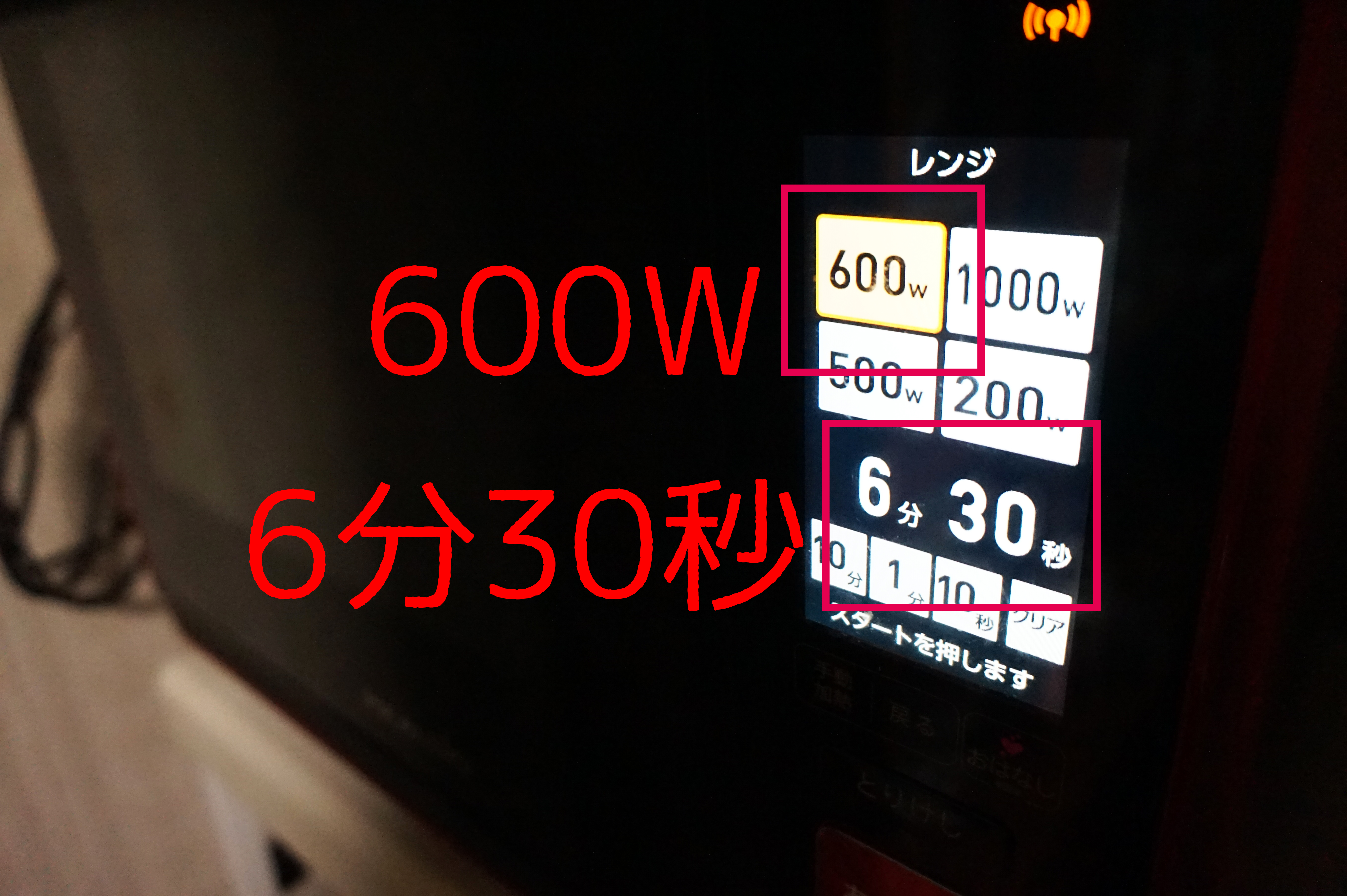 →「600Wで3分〜4分」もしくは「500Wで3分30秒〜4分」