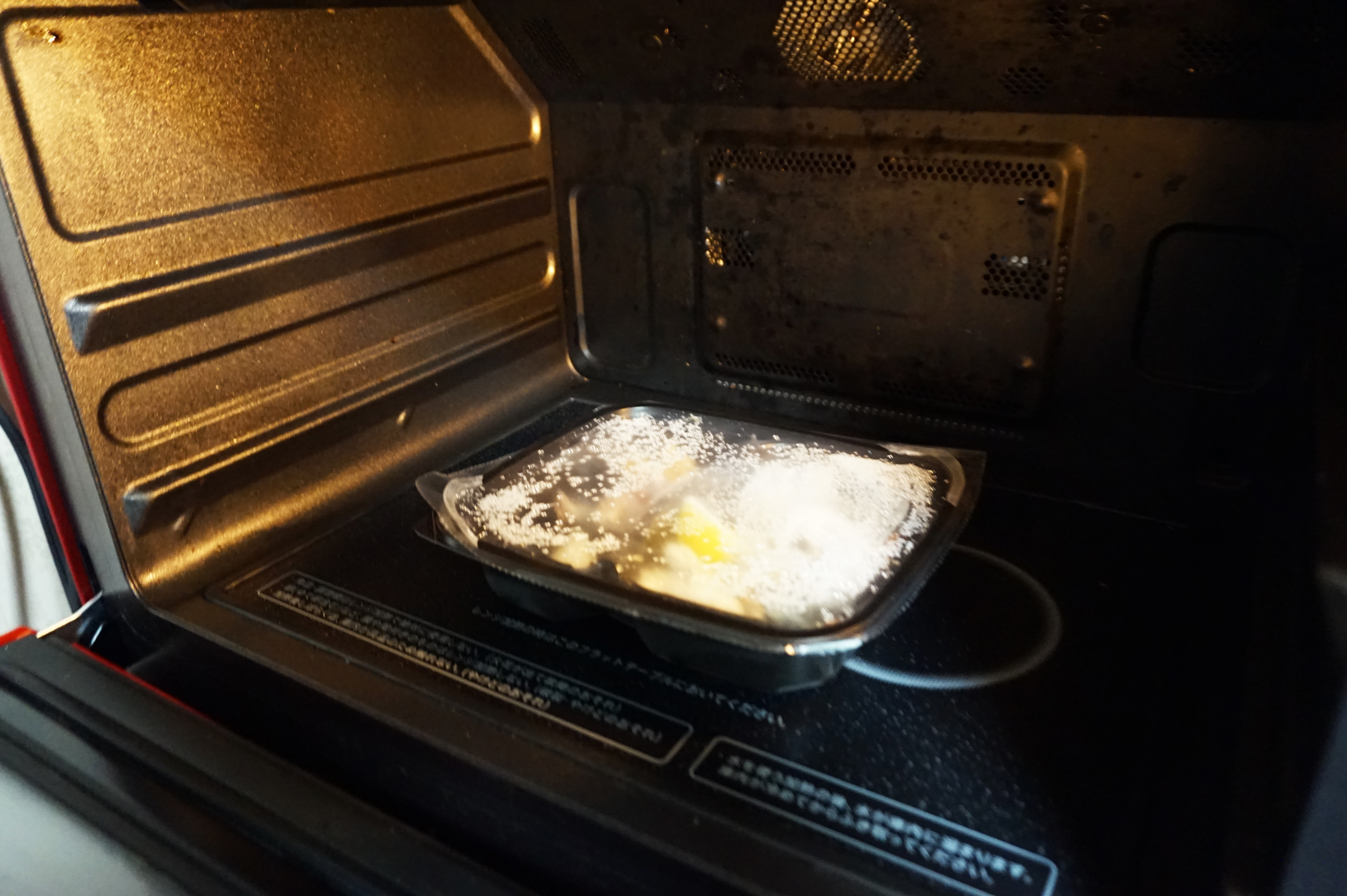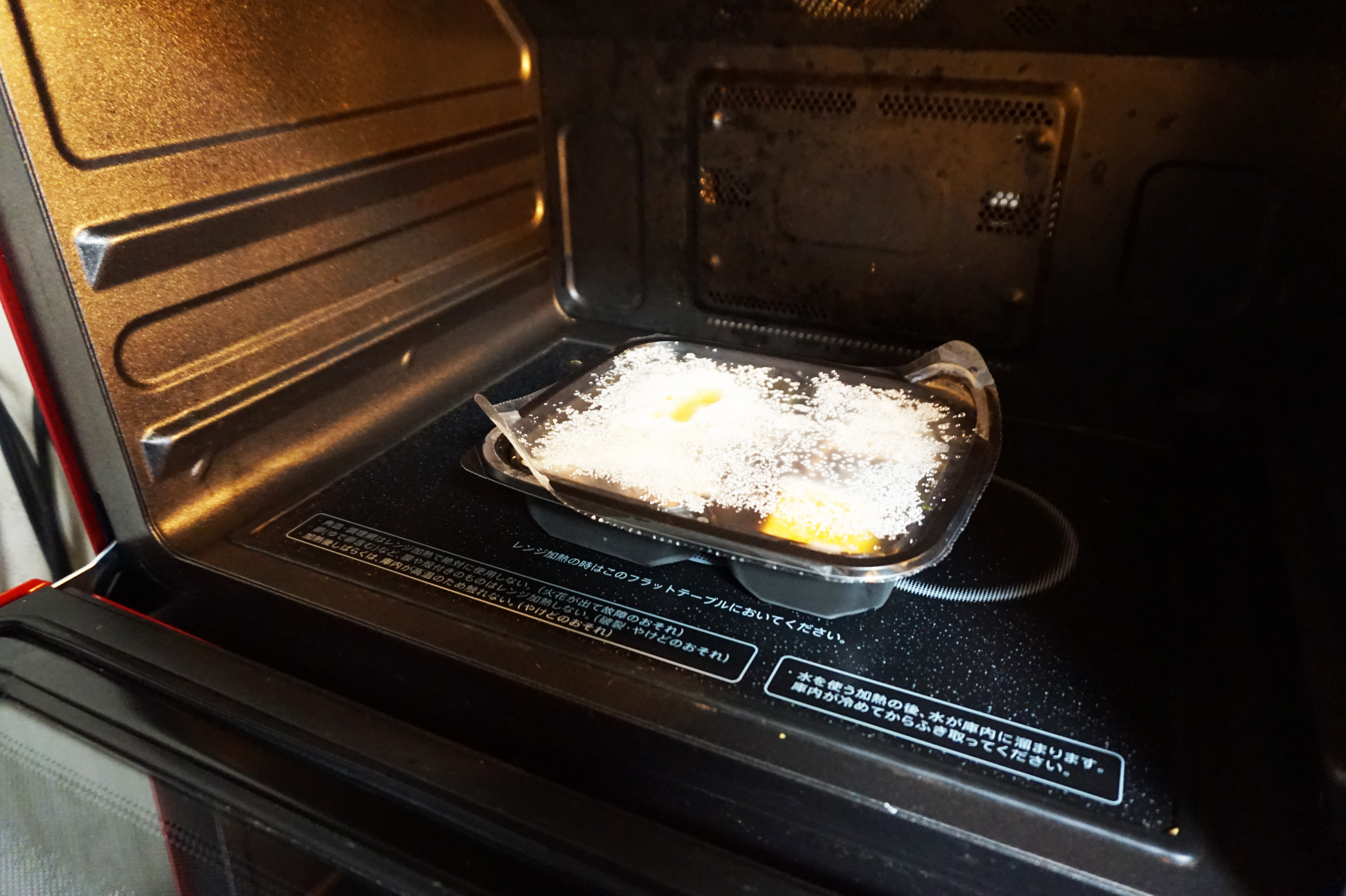 まずは両側のビニールを少しめくって、電子レンジの中へ。