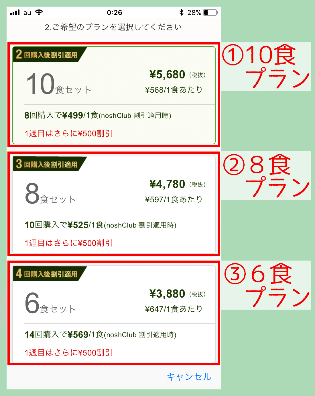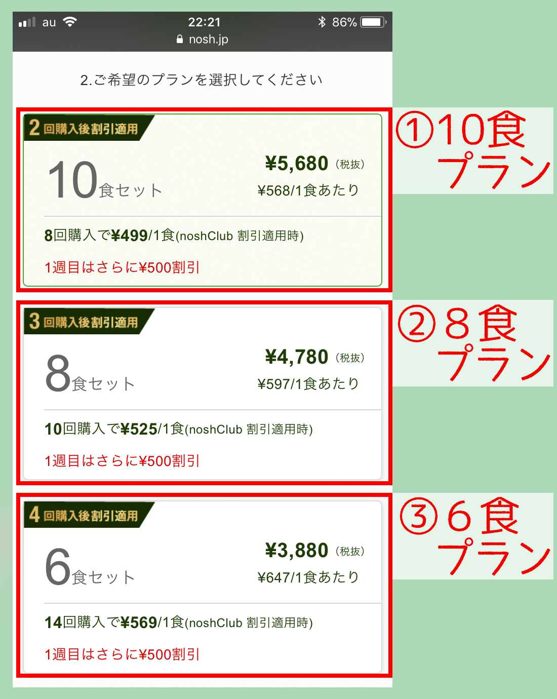 ここからはnosh(ナッシュ)のアプリで購入すると何食のプランを選べるのか、見ていきましょう!