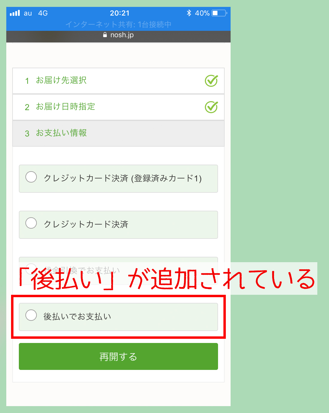 noshの商品が届いたタイミングでその場で支払いたい場合、