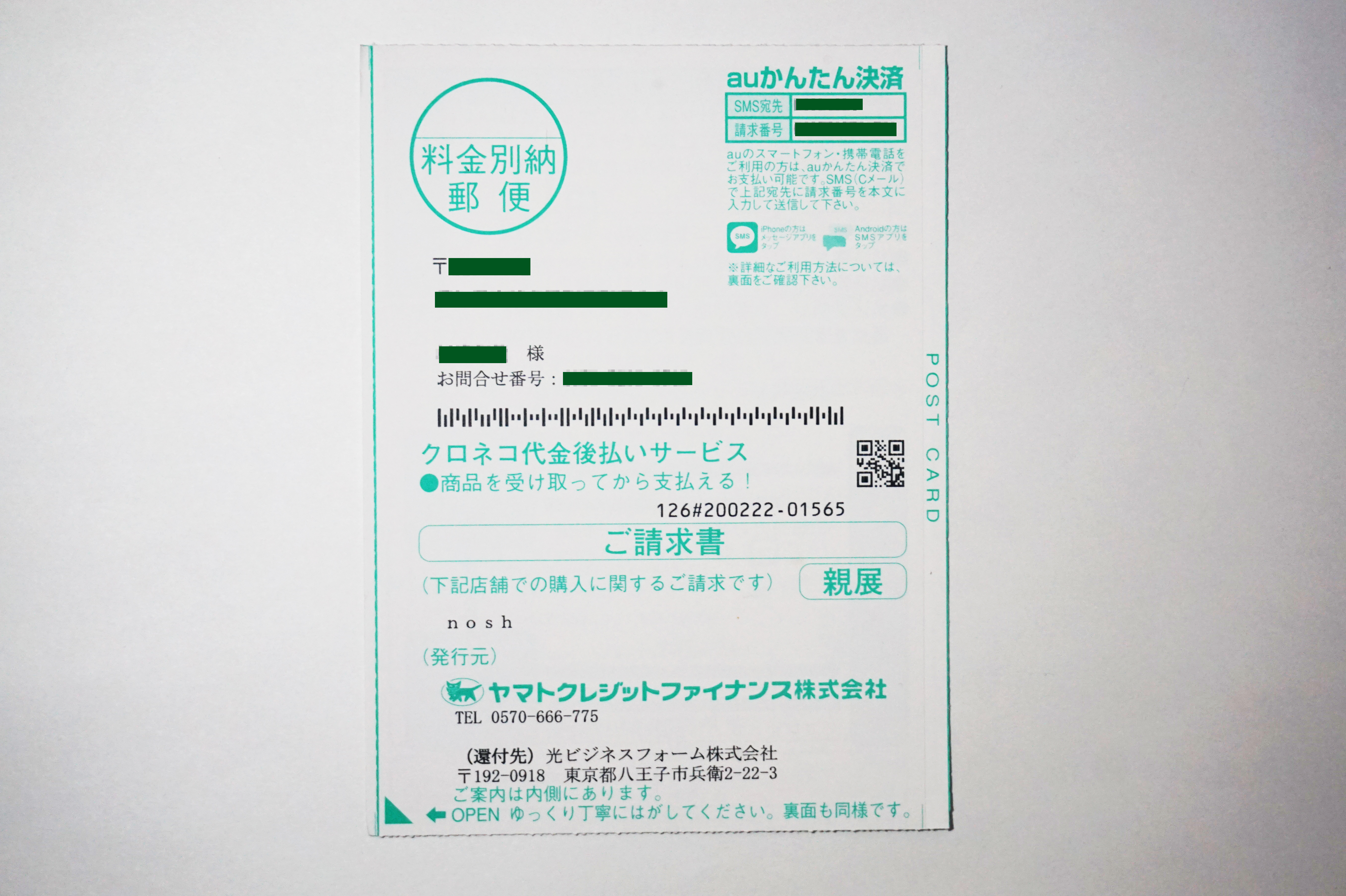 「後払いの場合、請求書は商品とは別に郵送されます」