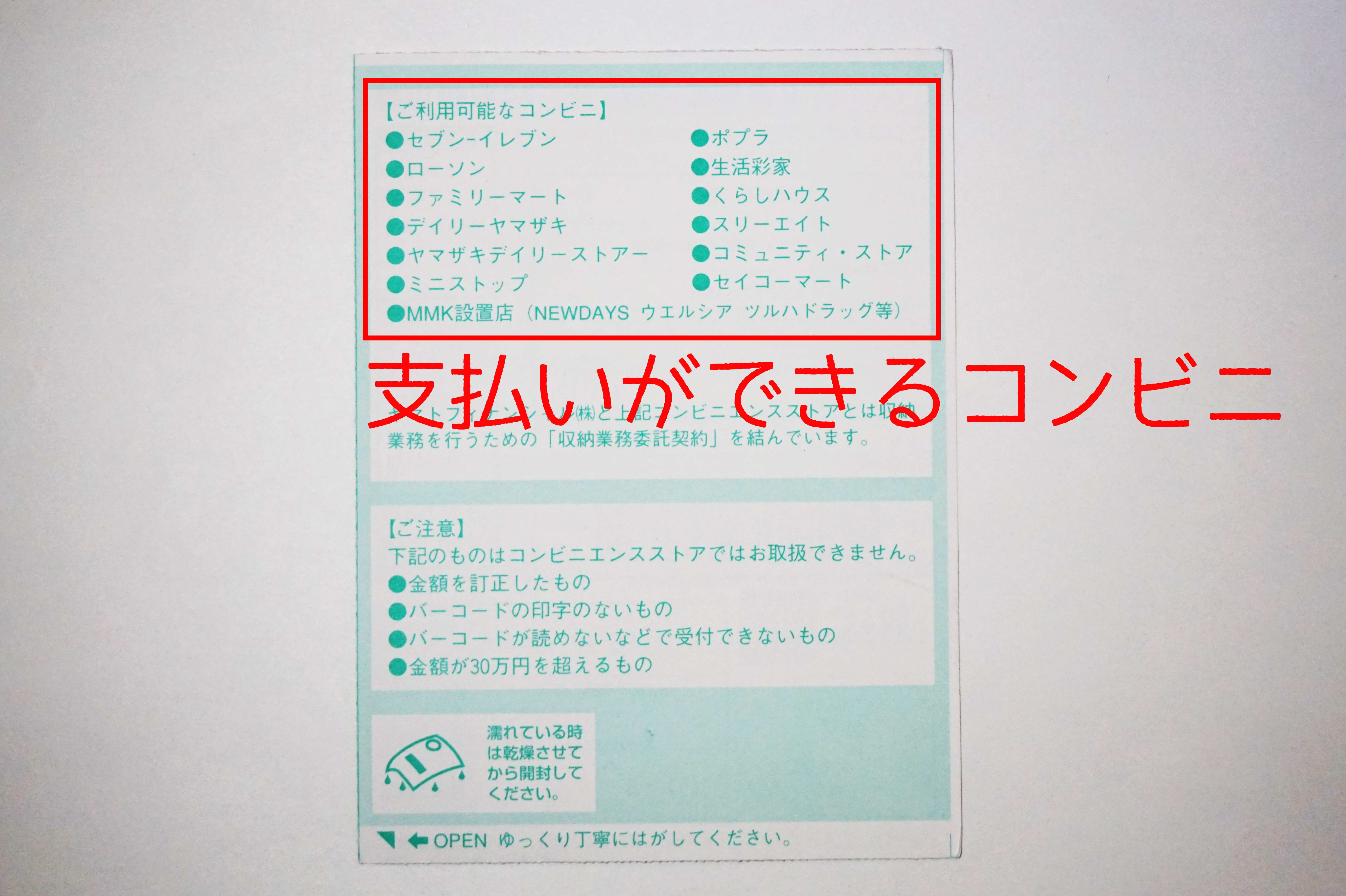 支払うことができるのは、コンビニと郵便局(主要な場所)とのこと。